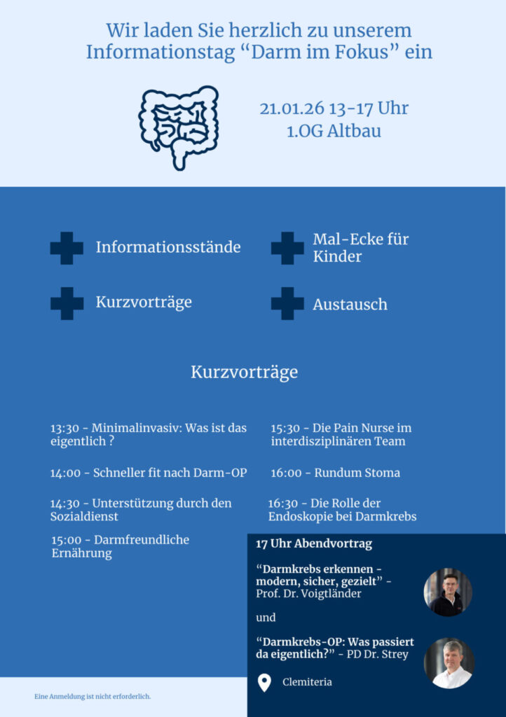 Am 21.01.2026 laden wir Sie herzlich zu unserem Informationstag „Darm im Fokus“ ein. Zwischen 13 und 17 Uhr haben Sie die Möglichkeit, mit unseren Fachteams ins Gespräch zu kommen, Fragen zu stellen und sich an Informationsständen umfassend zu informieren.